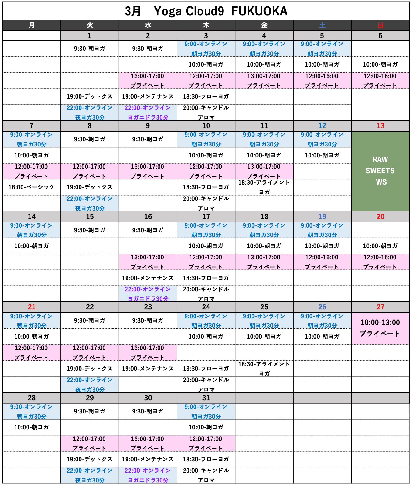 yoga, 全て 3月スケジュールのお知らせ。 2022-02-25 Yoga Cloud9 FUKUOKA 皆様こんにちは!いかがお過ごしでしょうか? 3月スケジュールのお知らせをさせていただきます。