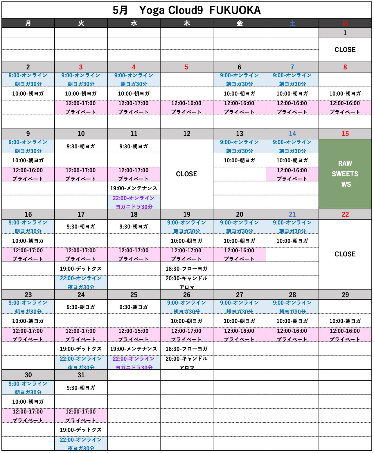 yoga, 全て 5月スケジュールのお知らせ。 2022-04-25 Yoga Cloud9 FUKUOKA 皆様こんにちは!いかがお過ごしでしょうか? 5月スケジュールのお知らせをさせていただきます。