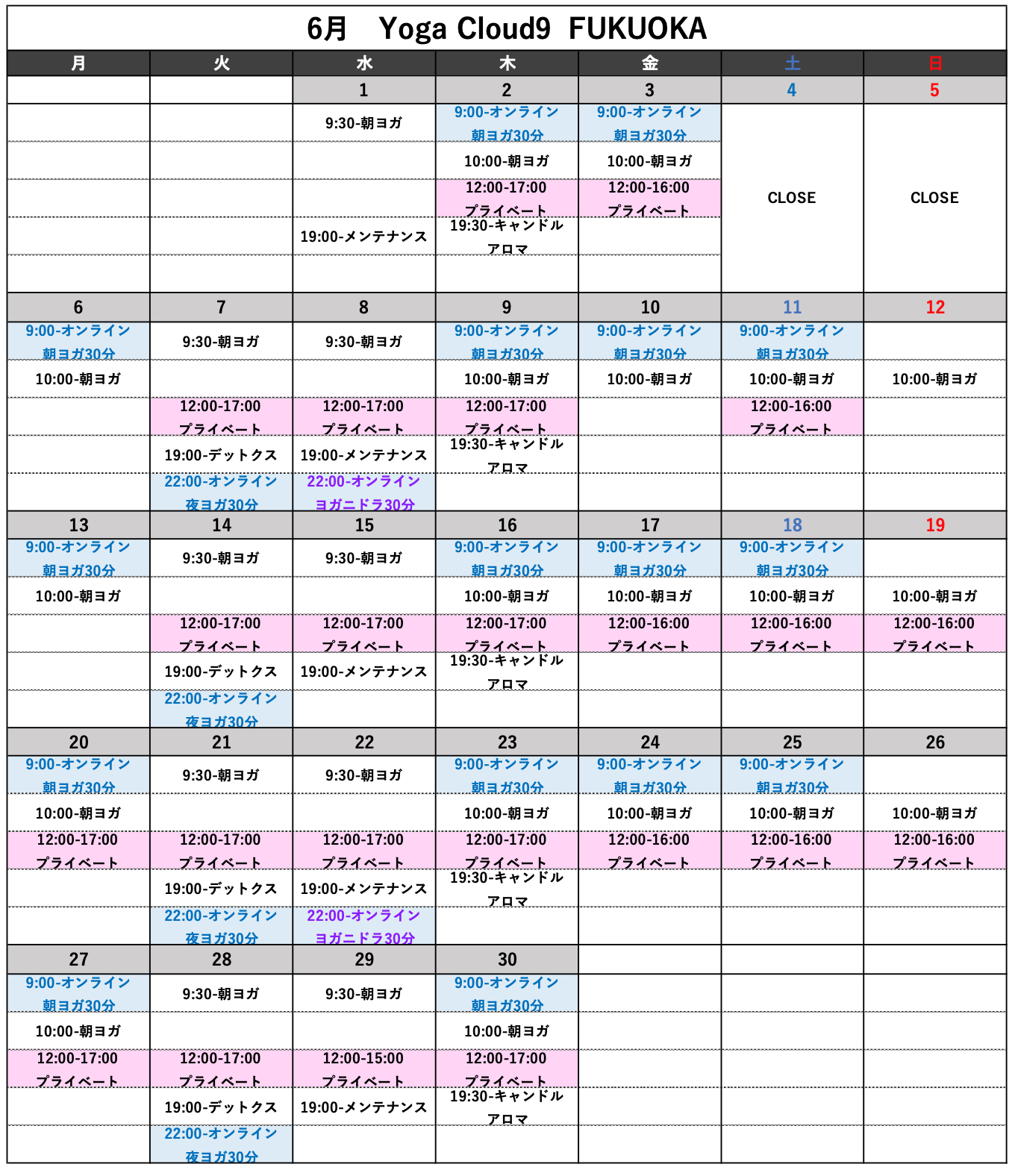 yoga, 全て 6月スケジュールのお知らせ。 2022-05-26 Yoga Cloud9 FUKUOKA 皆様こんにちは!いかがお過ごしでしょうか? 6月スケジュールのお知らせです。 あっという間に6月に入りますね!今年もあと半年💦 来月もどうぞよろしくお願いいたします🙏