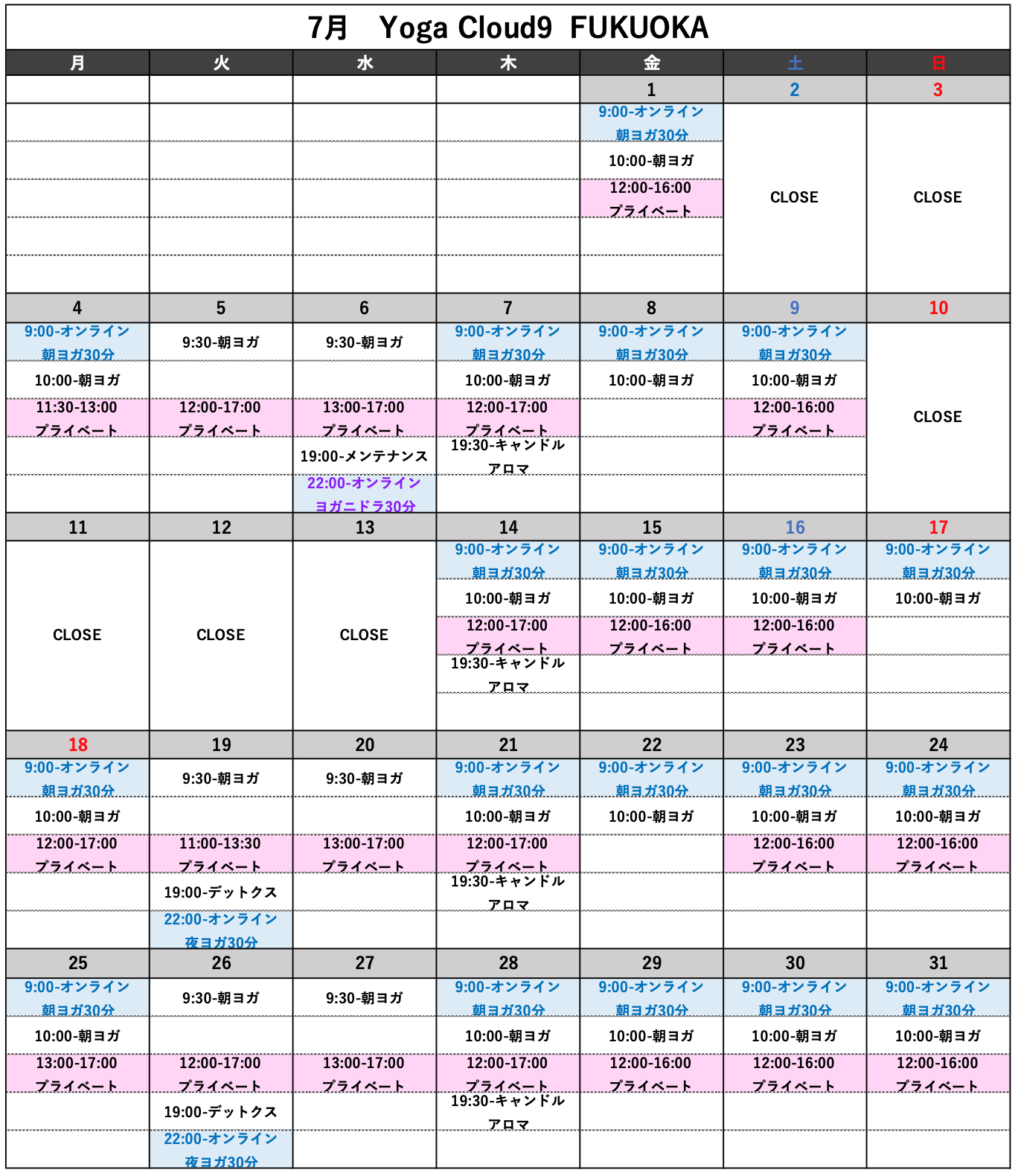 yoga, 全て 7月スケジュールのお知らせ。 2022-06-29 Yoga Cloud9 FUKUOKA 皆様こんにちは!いかがお過ごしでしょうか? 7月スケジュールのお知らせです。 いよいよこれから夏本番🌞体力付けて夏を乗り越えましょう😊 来月もどうぞよろしくお願いいたします🙏