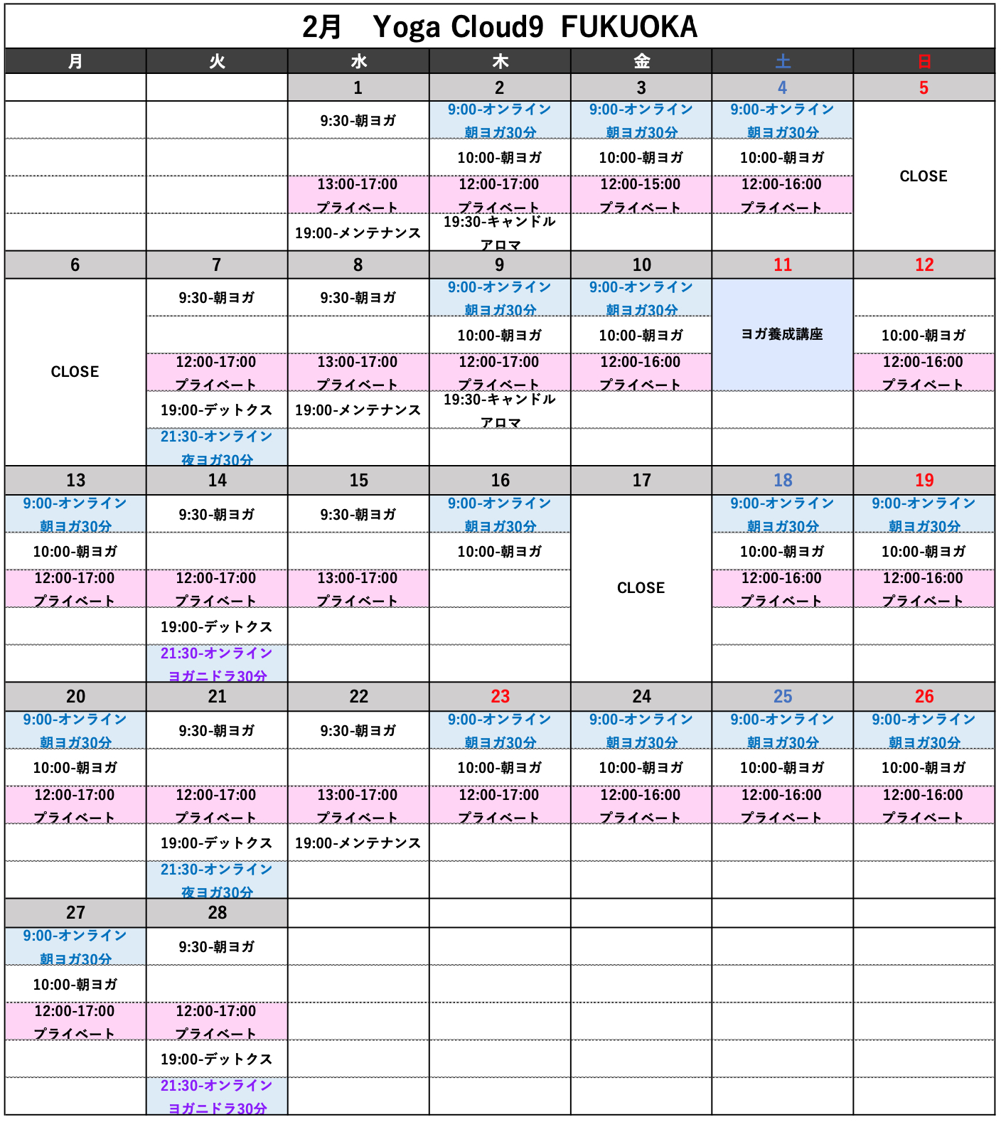 yoga, 全て 2023年2月スケジュールのお知らせ。 2023-01-26 Yoga Cloud9 FUKUOKA みなさんこんにちは! 2月のスケジュールをお知らせさせて頂きます。 来月もどうぞ宜しくお願い致します。