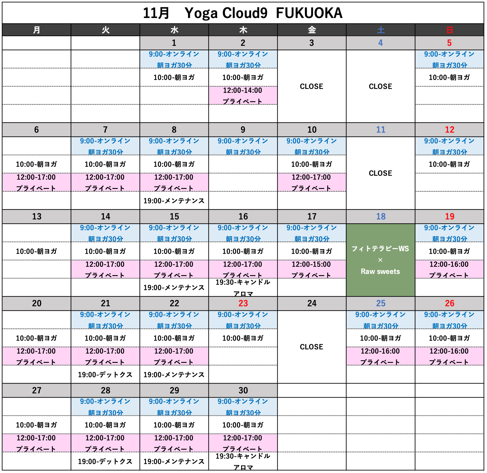 yoga, 全て 2023年11月スケジュールのお知らせ。 2023-10-20 Yoga Cloud9 FUKUOKA みなさんこんにちは! 11月のスケジュールをお知らせさせて頂きます。 来月もどうぞ宜しくお願い致します。