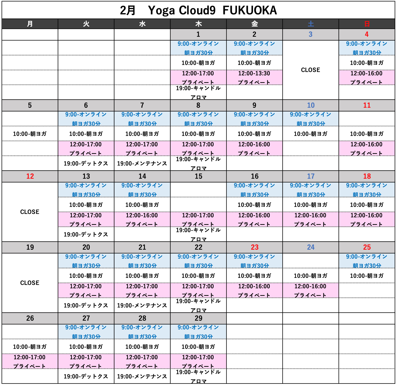 yoga, 全て 2024年2月スケジュールのお知らせ。 2024-01-25 Yoga Cloud9 FUKUOKA みなさんこんにちは! 2月のスケジュールをお知らせさせて頂きます。 来月もどうぞ宜しくお願い致します。