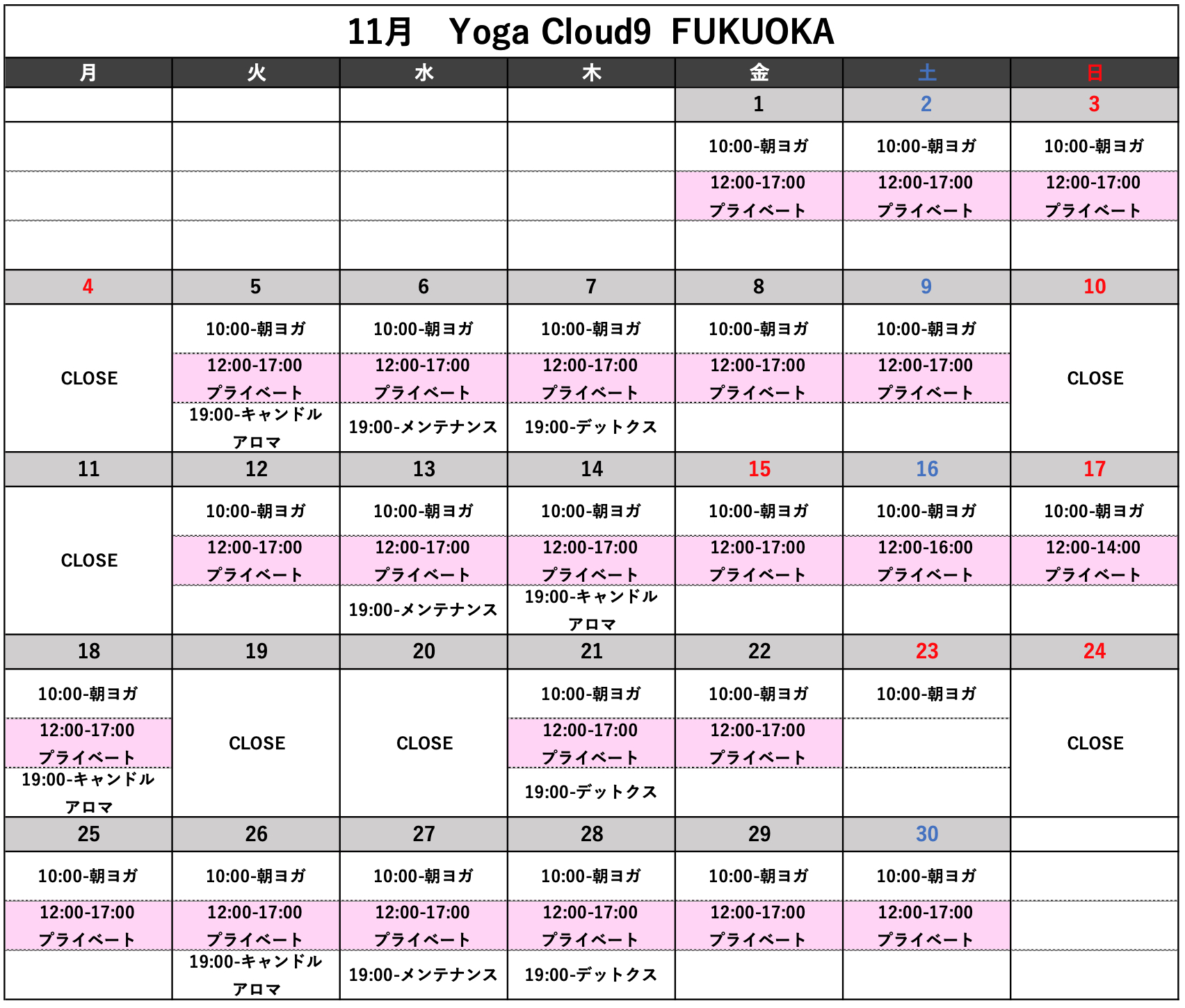 yoga, 全て 2024年11月スケジュールのお知らせ。 2024-10-24 Yoga Cloud9 FUKUOKA みなさんこんにちは! 11月のスケジュールをお知らせさせて頂きます。 来月もどうぞ宜しくお願い致します。