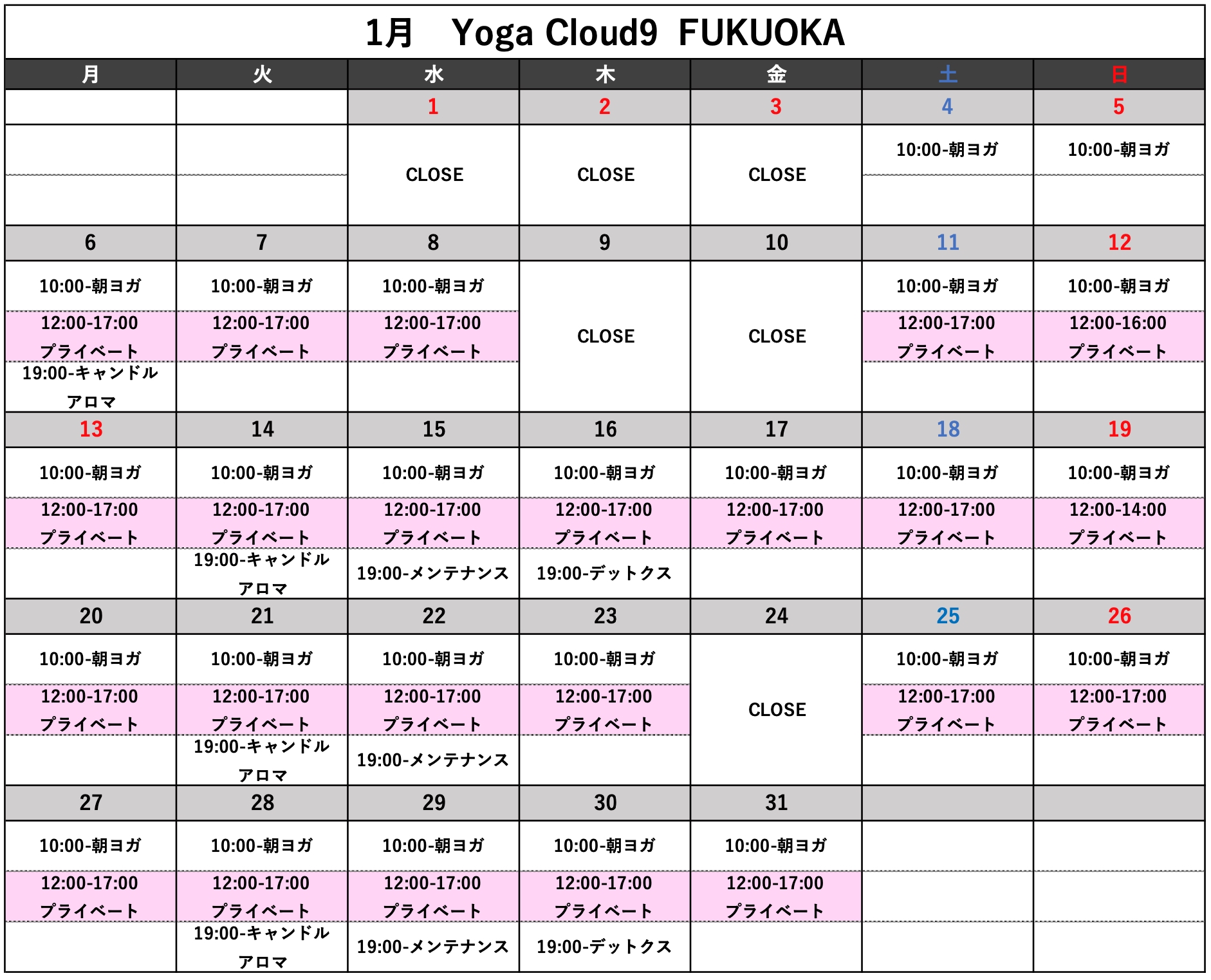 yoga, 全て 2025年1月スケジュールのお知らせ。 2024-12-26 Yoga Cloud9 FUKUOKA みなさんこんにちは! 1月のスケジュールをお知らせさせて頂きます。 来月もどうぞ宜しくお願い致します。